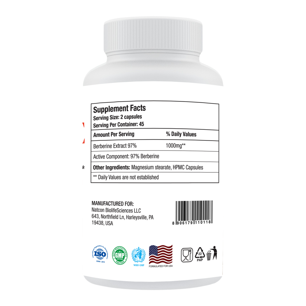 Berberine Capsules 97% Extract | 90 Veg Capsules, 45 days Supply| Pure & Natural | Chemical Free| Preservatives Free| 1000 mg per serving